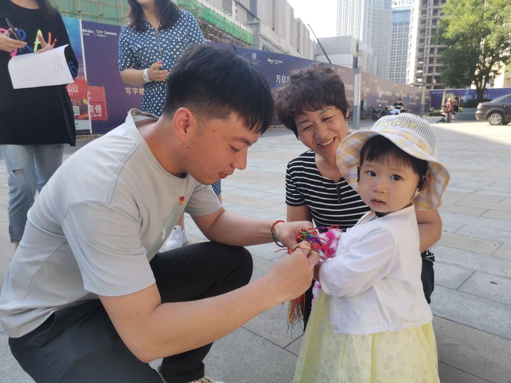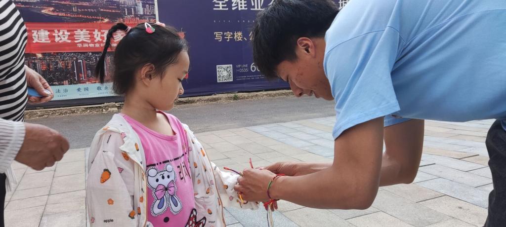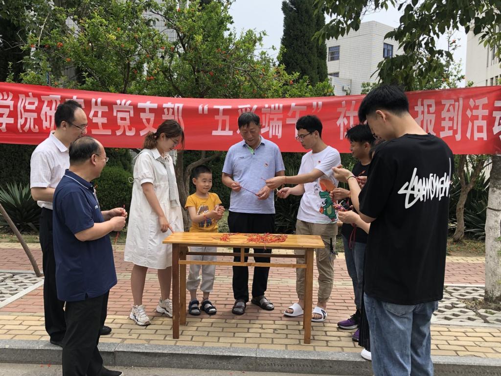 “轻汗微微透碧纨,明朝端午浴芳兰。流香涨腻满晴川,彩线轻缠红玉臂,小符斜挂绿云鬟,佳人相见一千年。”宋代词人苏轼的笔下,就曾出现了端午系五彩绳的习俗。为孩子系五彩绳是端午节的重要习俗,它有祈福纳吉的美好寓意。为了给华润社区的老人和孩子送上祝福,yl9193永利集团于端午期间举行了“五彩端午”社区双报到活动。机电学院党总支书记唐斌、院长马国清、副院长于涛、组织员勇玲娥以及研究生党支部党员参与了本次活动。