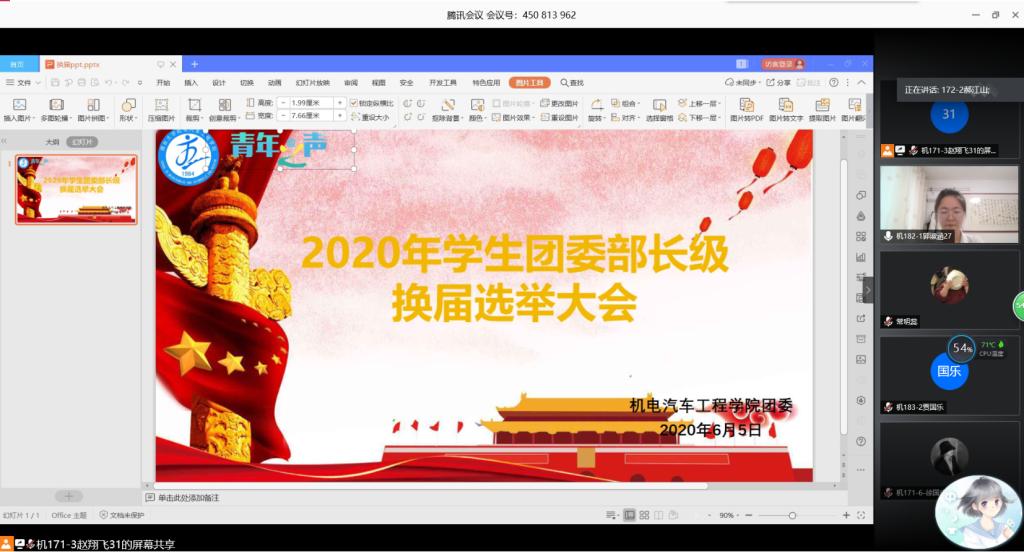 为选拔优秀团干部,传承学院优良的学生干部风气,壮大学院学生干部队伍,yl9193永利集团于6月5日通过腾讯会议举行学生团委线上换届活动,团委老师曲季、团委副书记赵翔飞、各部门部长以及所有竞选人员参加了此次会议。