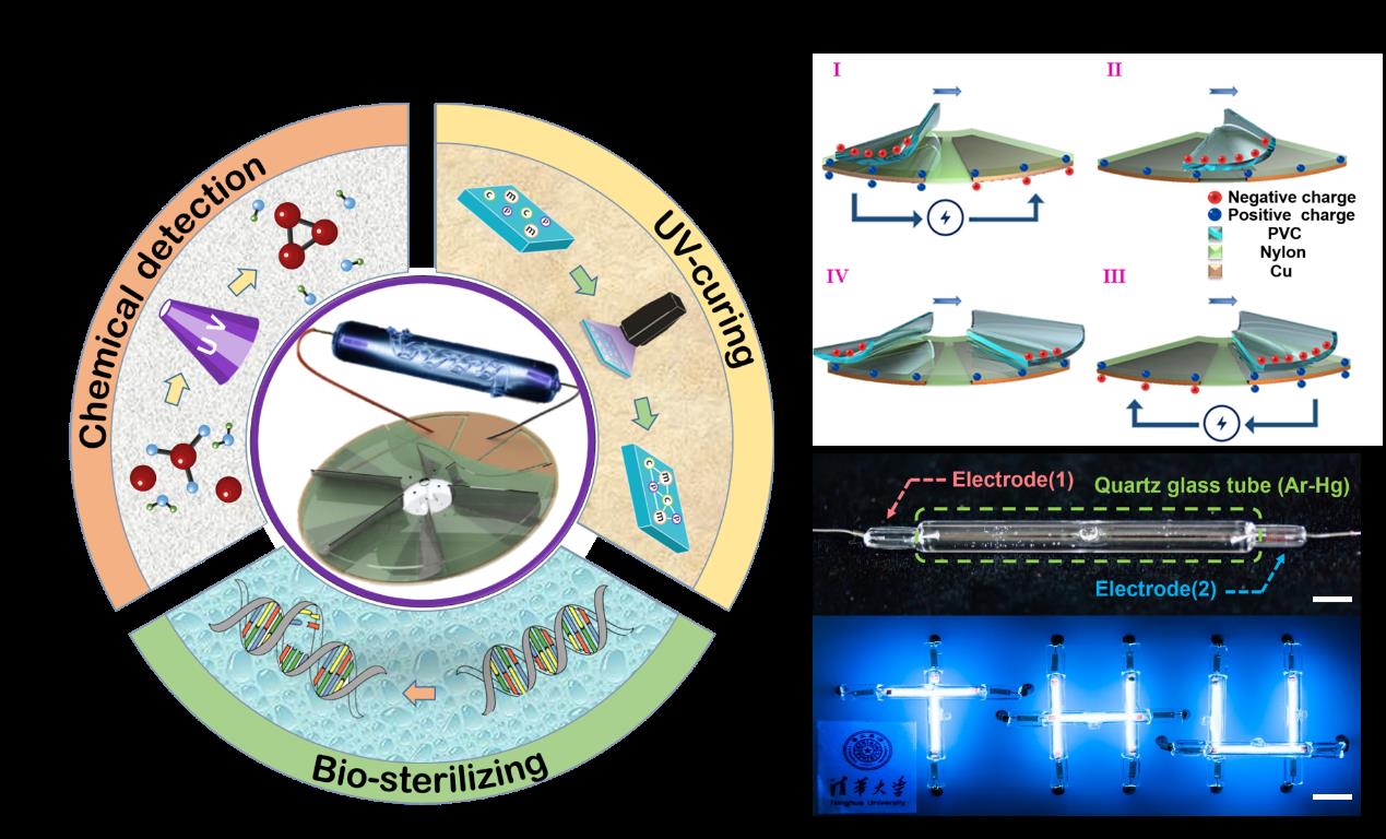 图1. 环境机械刺激驱动的分布式移动紫外光源(a)分布式移动紫外光源概念图 (b)摩擦纳米发电机工作原理图 (c)紫外线发生器实物及图案化