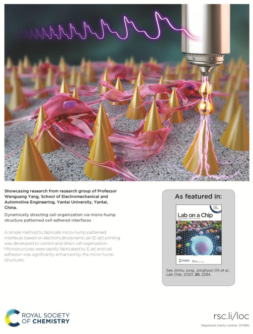 近日,国际著名学术期刊Lab on a Chip (中科院一区,TOP类期刊)以封面论文的形式邀请刊载了永利集团机电学院面向生物医疗的跨尺度智能制造团队利用机器人化的微纳制造技术在组织工程领域的最新研究成果——Dynamically directing cell organization via microhump structure patterned cell-adhered interfaces,时隔2个月,该研究团队成果再获国际著名学术期刊封面刊载,机电学院杨文广老师为该研究论文的第一和通信作者。