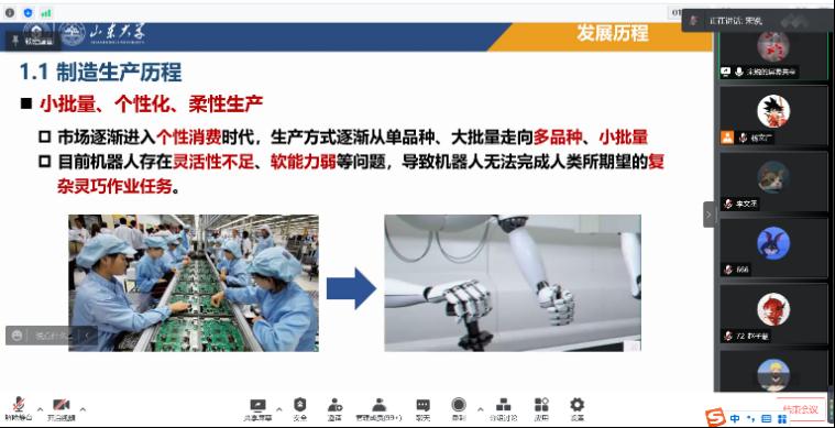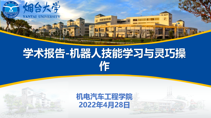 4月28日晚上,yl9193永利集团举办题为“机器人技能学习与灵巧操作”的报告会,本次报告会由山东大学科学技术研究院副院长,长江学者,宋锐教授主讲,我院部分老师和研究生参加报告会,报告会采用线上形式进行。