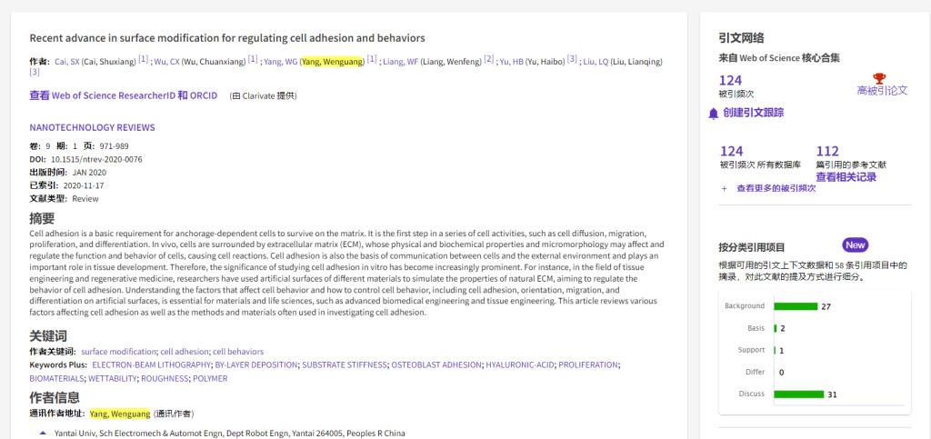 根据Essential Science Indicators(简称ESI)2023年1月公布的最新统计结果,我院教师杨文广老师发表于《NANOTECHNOLOGY REVIEWS》的论文《Recent advance in surface modification for regulating cell adhesion and behaviors》入选ESI高被引论文。该论文以永利集团为第一署名单位,杨文广老师为唯一通讯作者。