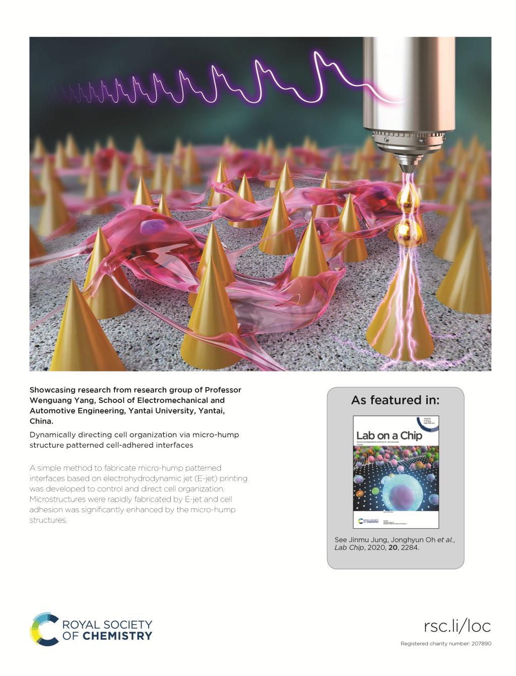 近日,国际著名学术期刊Lab on a Chip (中科院一区,TOP类期刊)以封面论文的形式邀请刊载了永利集团机电学院面向生物医疗的跨尺度智能制造团队利用机器人化的微纳制造技术在组织工程领域的最新研究成果——Dynamically directing cell organization via microhump structure patterned cell-adhered interfaces,时隔2个月,该研究团队成果再获国际著名学术期刊封面刊载,机电学院杨文广老师为该研究论文的第一和通信作者。